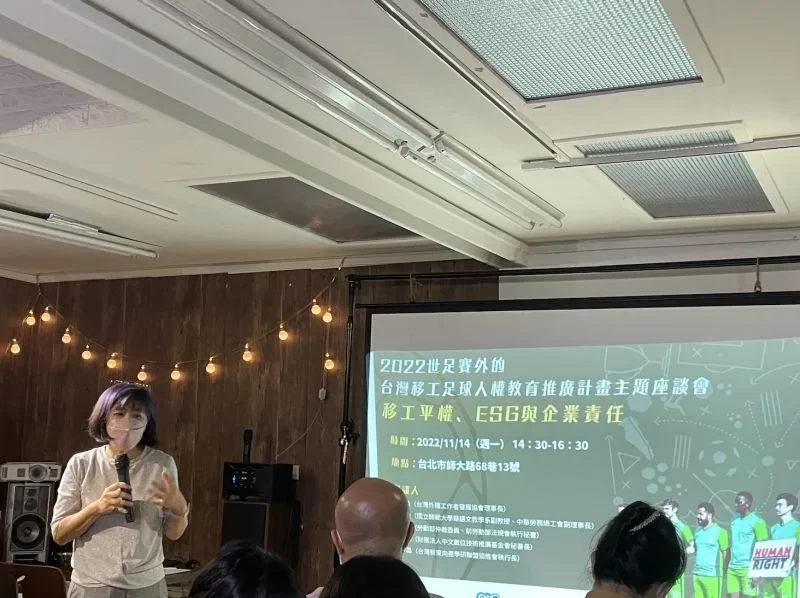 我國的移工人數早已超過71萬人,然而他們的權益仍尚未被廣泛地重視。2022世足賽外的台灣移工足球人權教育推廣計畫主題《移工平權、ESG與企業責任》座談會於今(14)日下午兩點半舉行,現場出席嘉賓有任職於國立師範大學華語文教學系副教授和中華勞務總工會副理事長楊聰榮、勞動部仲裁委員和前勞動部法規會執行秘書孟藹倫、台灣外籍工作者發展協會理事長徐瑞希、財團法人中文數位技術推廣基金會秘書長魏梅林和台灣新東向產學研聯盟協進會執行長陳孝昌,以及師大的學生們,現場座無虛席。