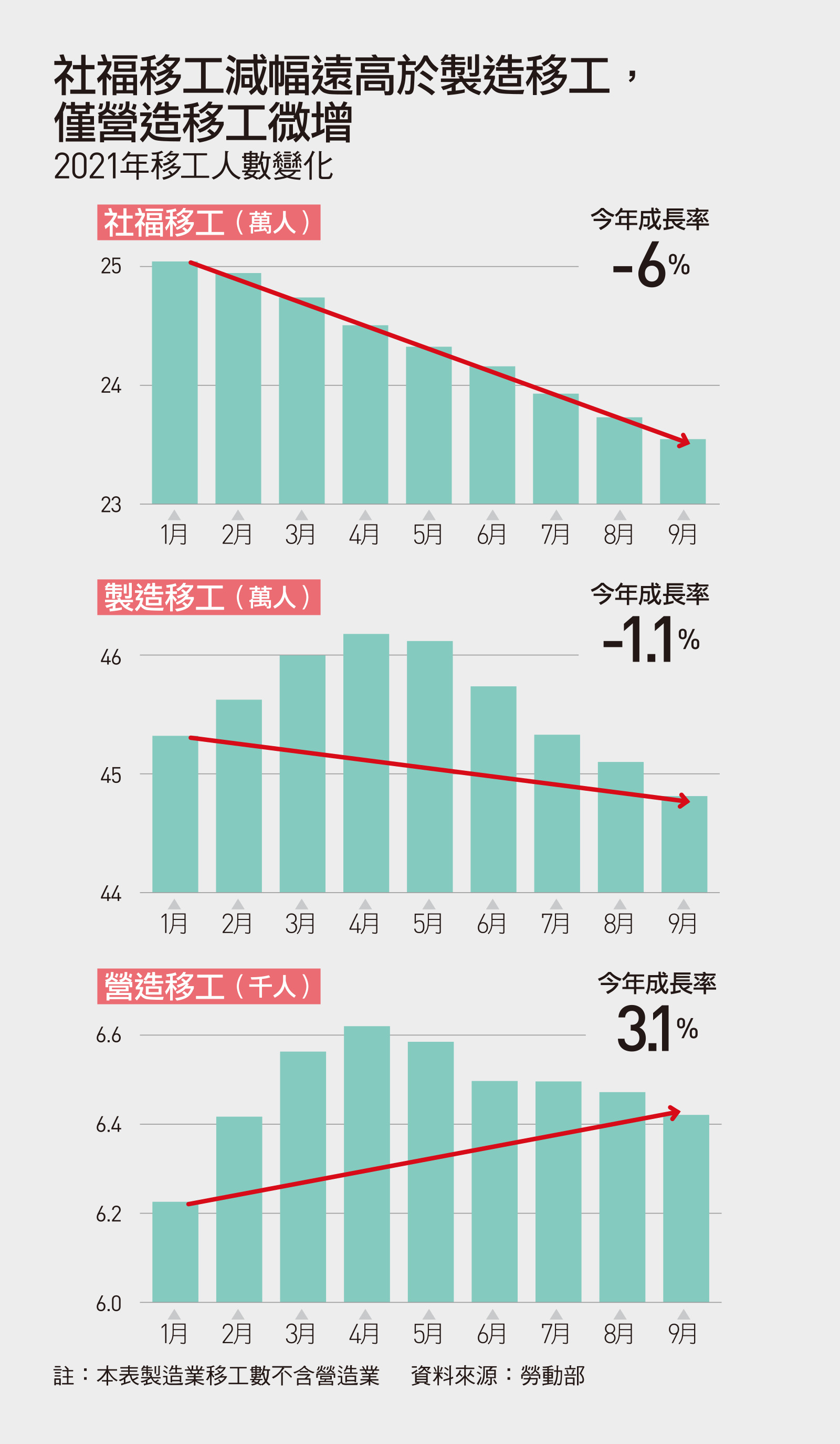 但截至9月,國內社福移工今年以來已減少約1.5萬人,減幅是製造業移工(不含營造)的逾5倍,顯示長照人力缺口嚴峻。