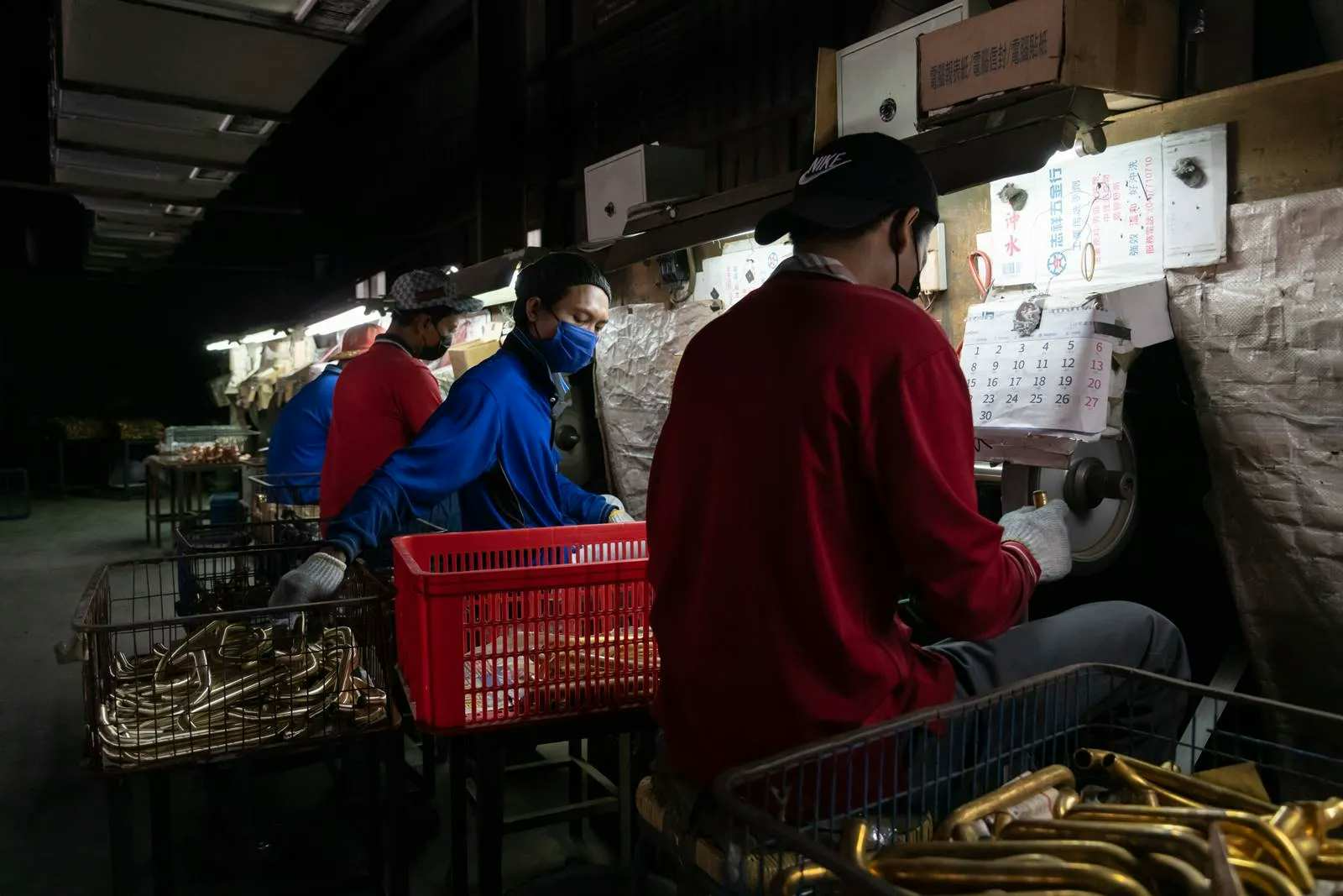 走進工廠,拋光的產線上,除了一名年過半百、頭髮花白的台籍老師傅,其餘是十來個印尼移工,他們坐著高腳椅,拿著水龍頭在機台前拋光,動作整齊劃一、機械般地反覆,金屬碰撞的聲響震耳欲聾。《天下》記者必須扯開喉嚨,才能跟旁人對話。