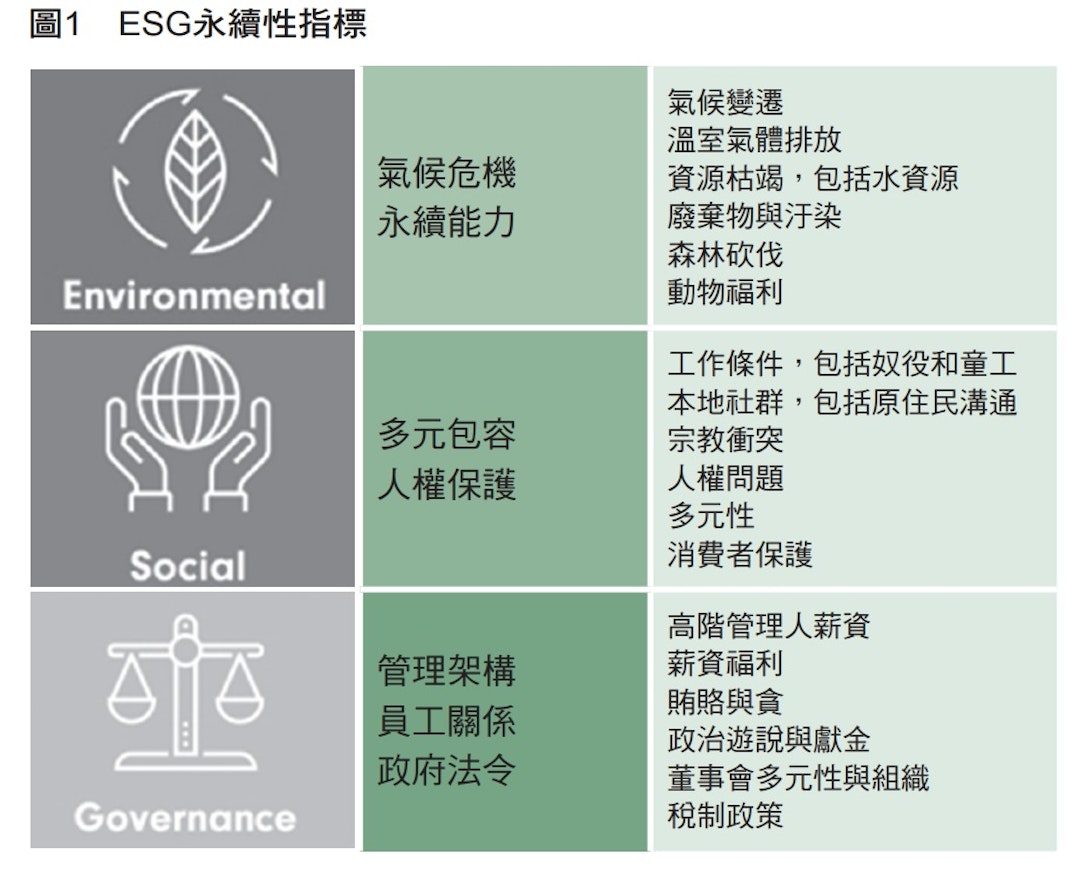 ESG,代表Environmental環境永續、Social社會參與,及Governance公司治理的三個企業經營層面。根據維基百科,ESG是「公司治理」對「社會」及「環境」所展現的良心與責任,是一套完整衡量企業永續性的指標。