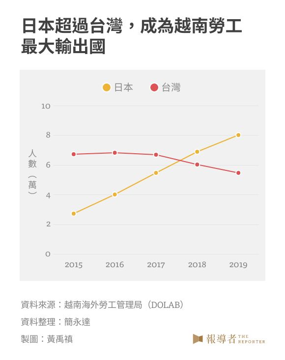 過去,越南移工首選出國工作的國度是台灣,但這個情況在過去兩年間改變。2018年,日本首次超過台灣,成為越南勞工最大輸出國。根據越南政府統計,2019年全年約15萬名越南勞工出國工作,超過5成前往日本,約8萬人,台灣只有5萬4千人,差距持續拉大。