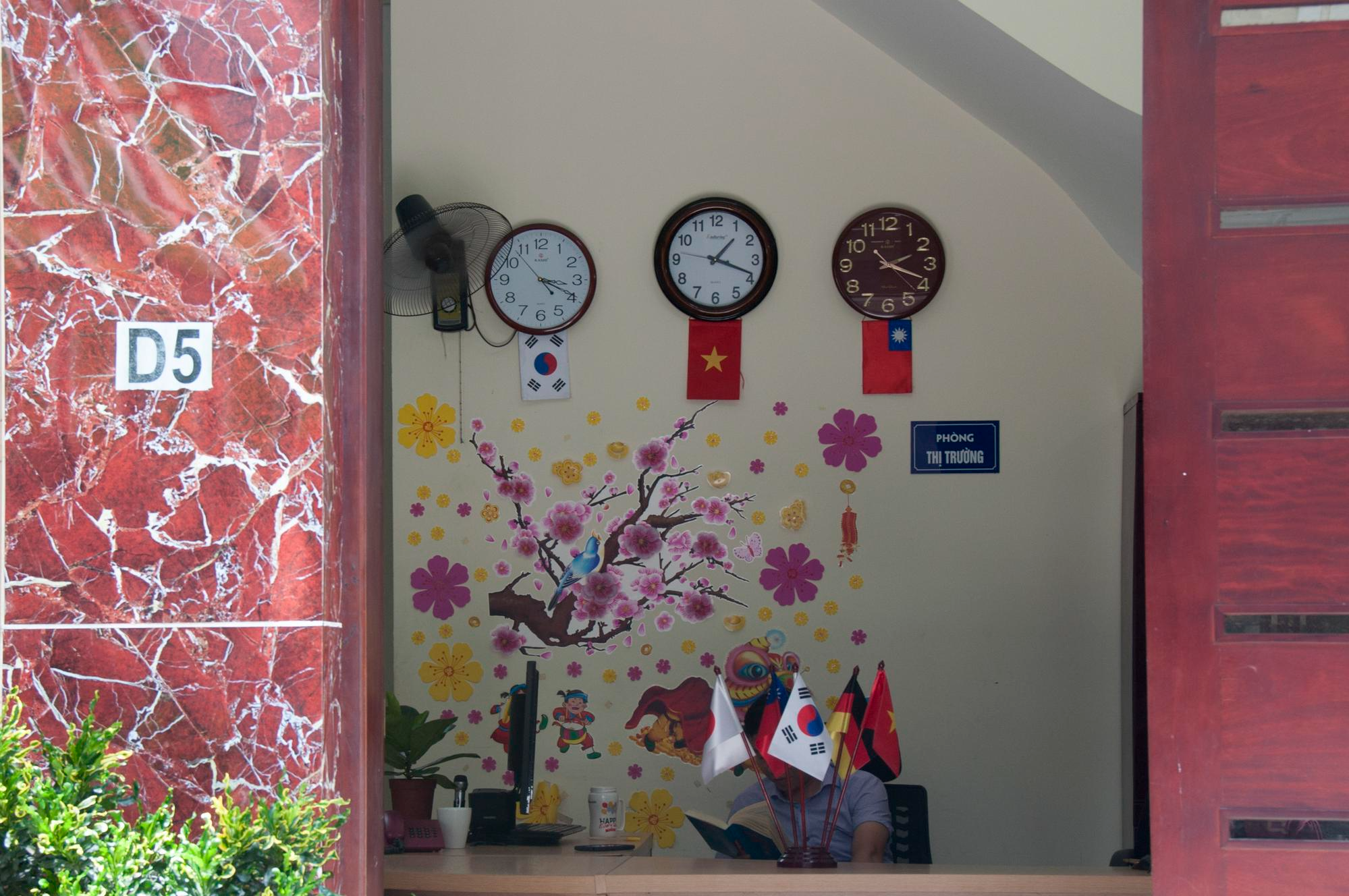 專營台灣市場的越南仲介公司,門口沒有明顯的招牌,桌上的中華民國國旗是少數可辨認的線索