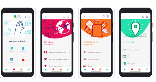 Just Good Work 是一個互動的APP,上面的訊息是教導一個移工從決定到海外工作開始到回到家鄉所需要的所有資訊,包含合約的內容、護照、應得的假期及病假,當地能有哪些合適的工作、更有由移工撰寫真實的故事分享,目前有來自像是印尼、孟加拉、肯亞、尼泊爾尼等12個國家的語言版本。