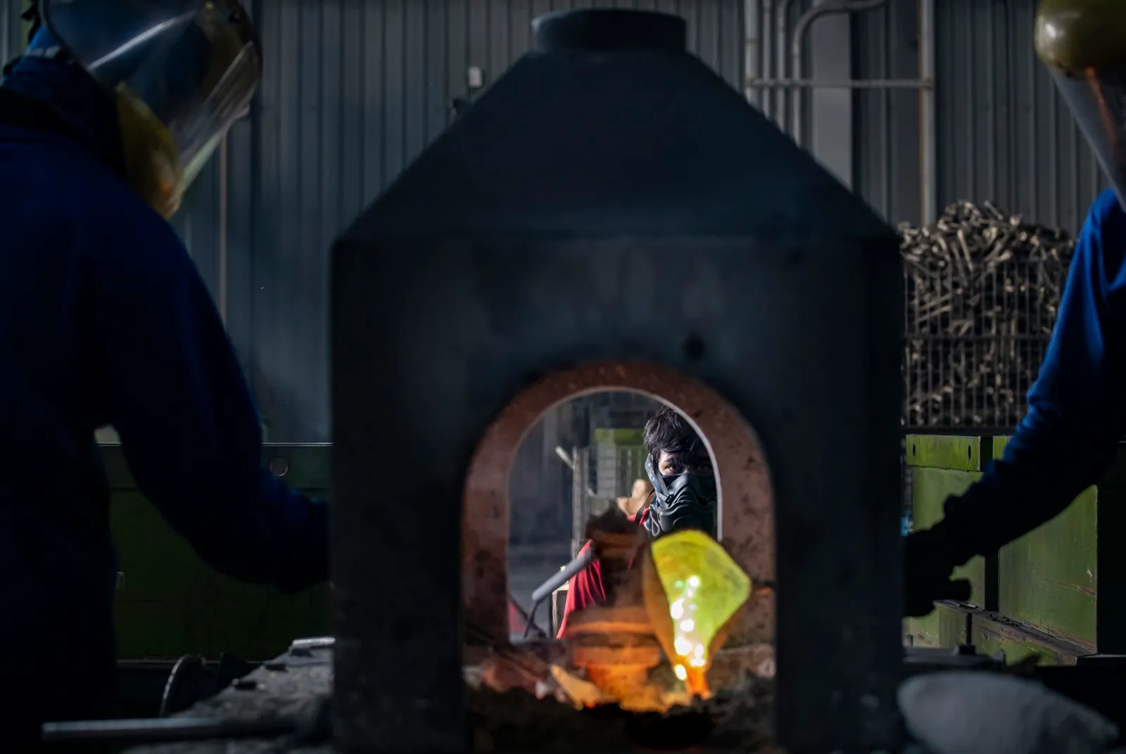 彰化水五金廠,印尼移工把900℃的銅液,舀進水龍頭模具上成形。因為現場太熱,要三人輪流作業。圖片來源:謝佩穎攝