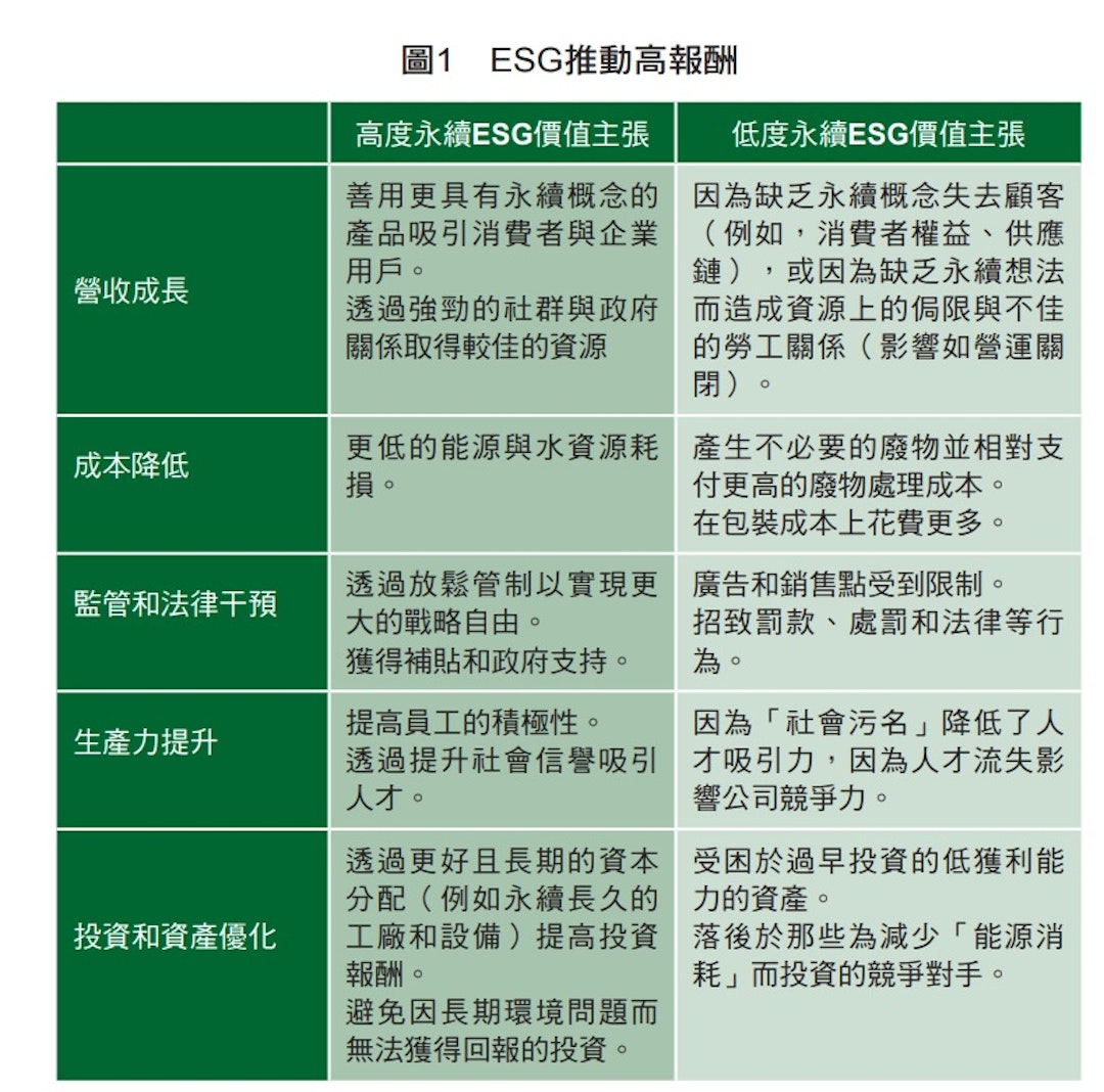 1.取得更高的成長:ESG含金量高的產品,吸引更多的企業客戶及一般消費者,同時可以獲得社區及政府的強力支持,因而可以更容易取得所需資源。